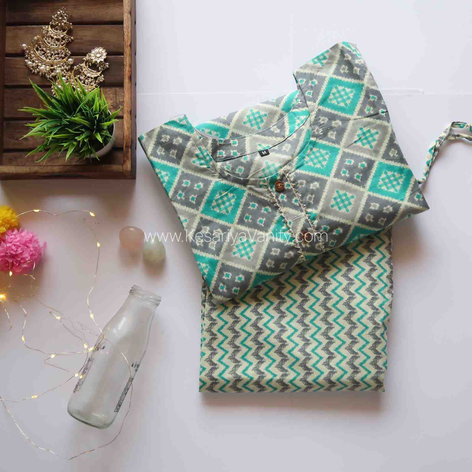 cotton kurta with cotton pants, Half drawstring and half elastic closure.