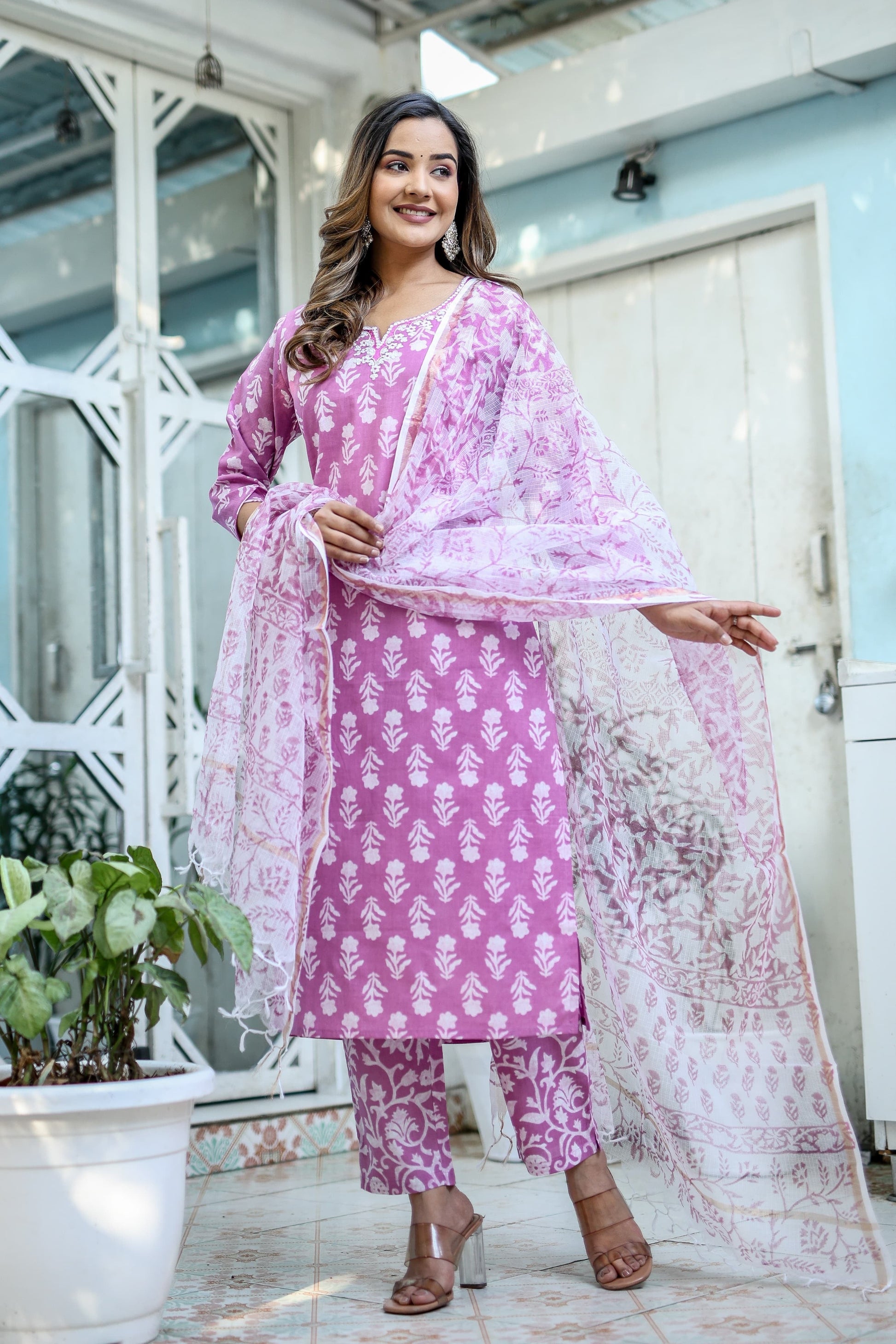 Completing the ensemble is a Kota Doriya handblock printed dupatta in the same lovely pink hue as the kurta and pants. The dupatta features intricate patterns that echo the floral motifs, adding depth and texture to the outfit while tying the entire look together seamlessly.