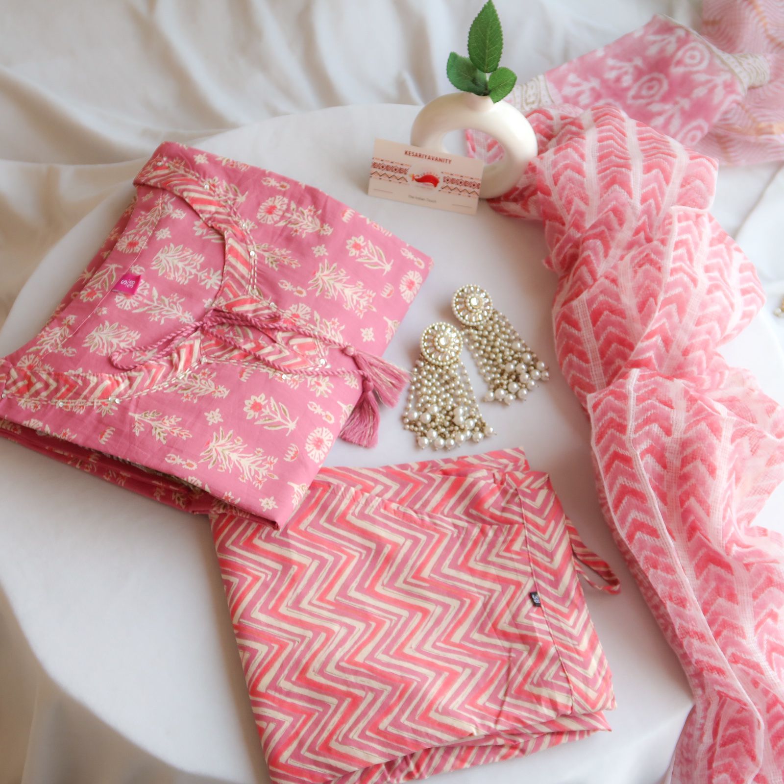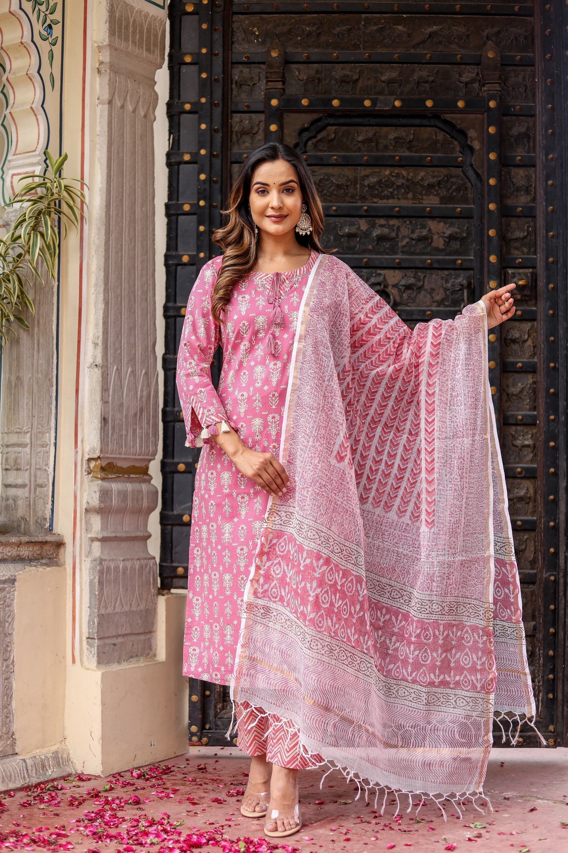 The ensemble includes striking straight pants, highlighted with a vibrant zig-zag pattern in shades of red, cream, and grey, adding a touch of contemporary flair. Completing the look is a matching Kota Doriya handblock printed dupatta, harmonizing seamlessly with the kurta and pants. Perfect for any occasion, this suit set effortlessly blends traditional craftsmanship with modern design.