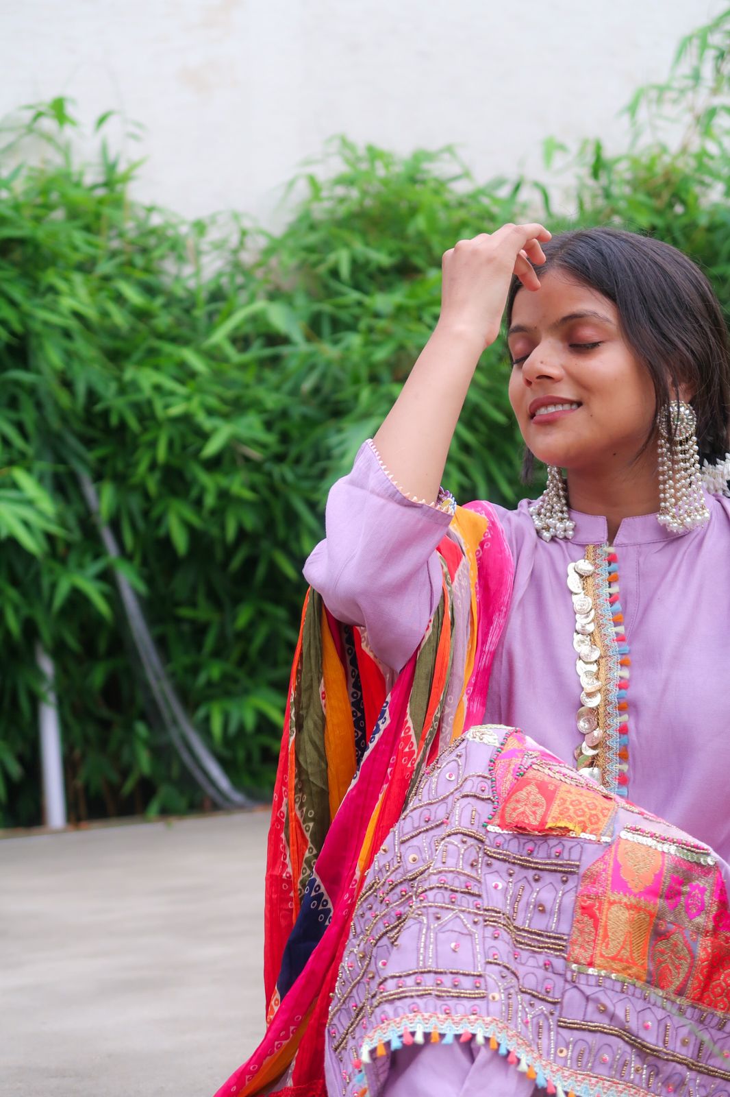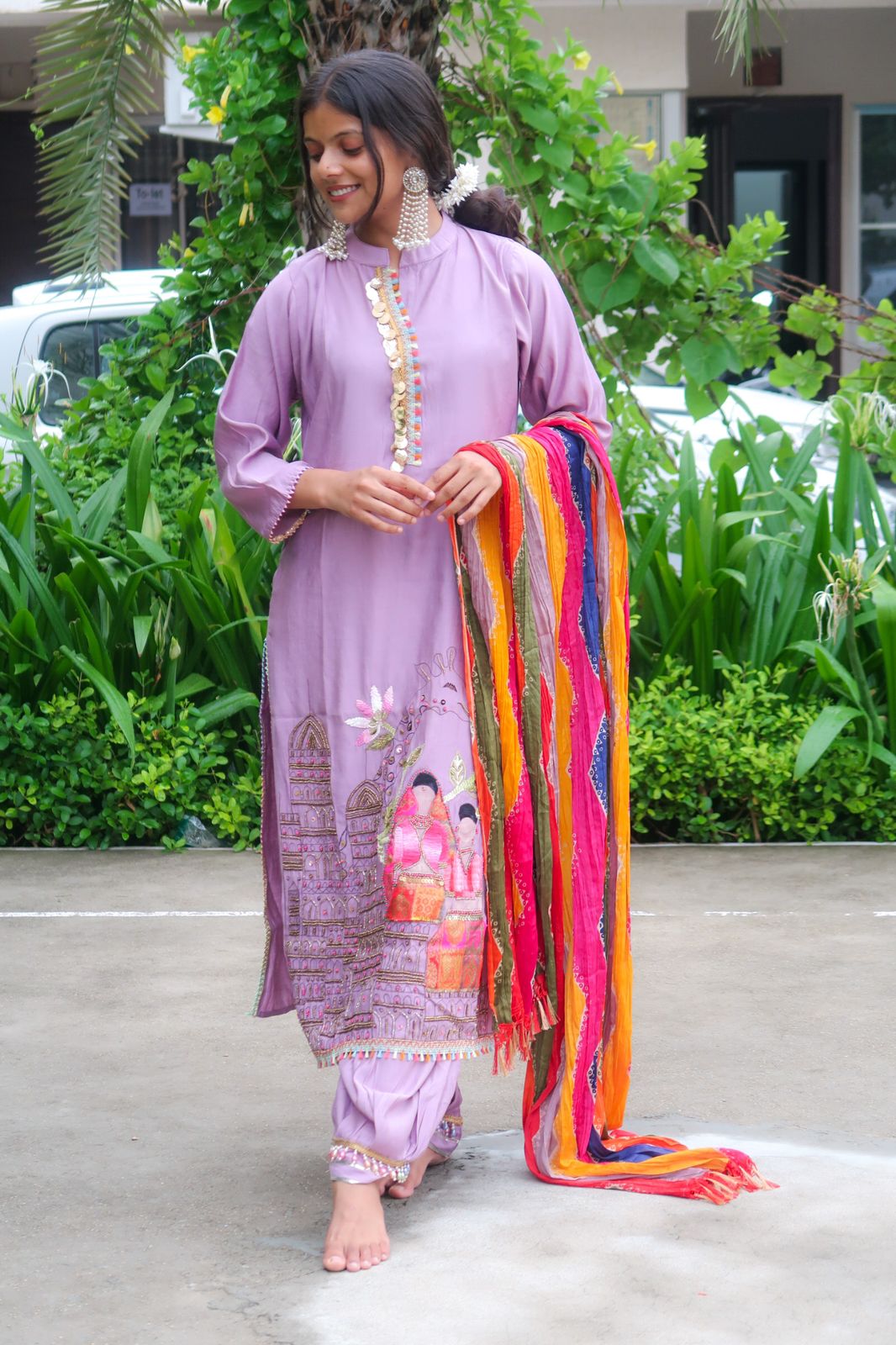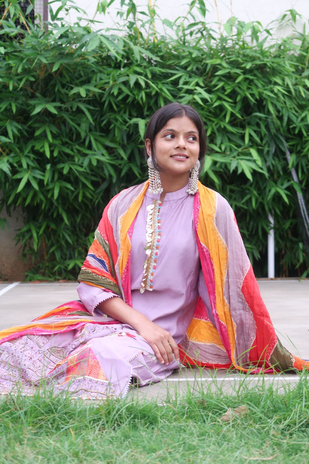 Introducing our enchanting Suit Set, featuring a mesmerizing lilac purple color kurta and pants adorned with intricate handwork of thread, moti, and sequins. This suit set showcases the perfect blend of traditional craftsmanship and contemporary elegance, enhanced by the vibrant multicolour bandhani dupatta.