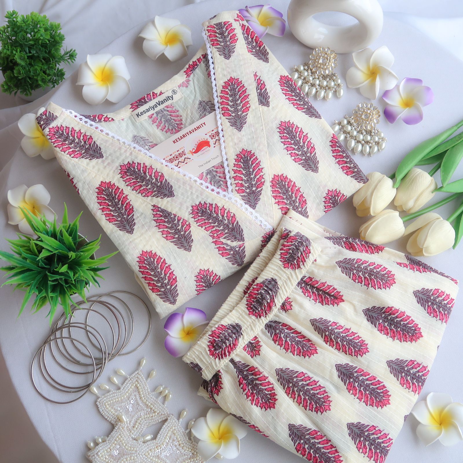 Introducing our sophisticated Pure Cotton Kurta Pants Set, a timeless addition to your ethnic wardrobe. The kurta features an elegant off-white base adorned with striking red and grey motifs, creating a captivating pattern that exudes understated charm. The V-neckline is embellished with delicate white lace, adding a touch of grace to the ensemble.