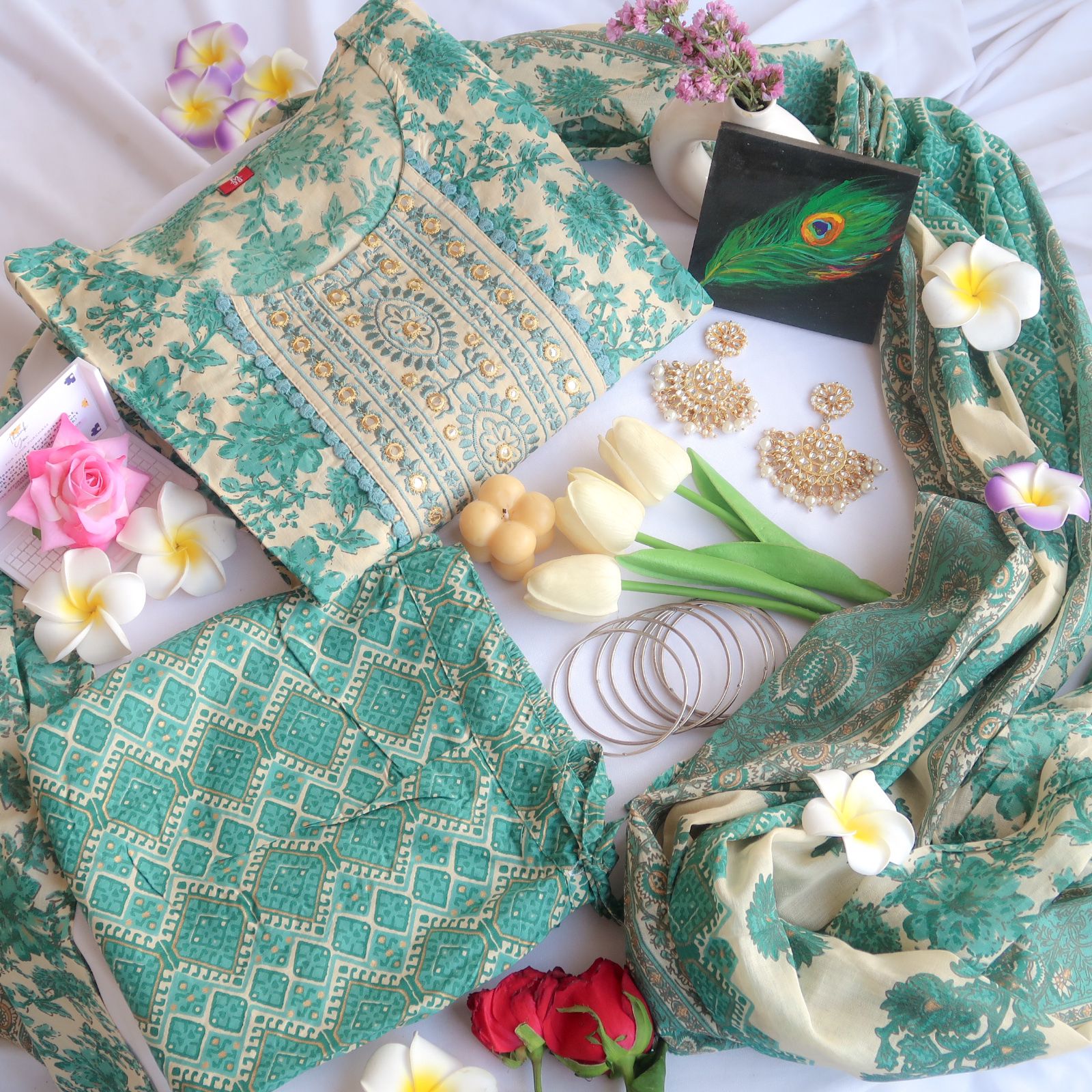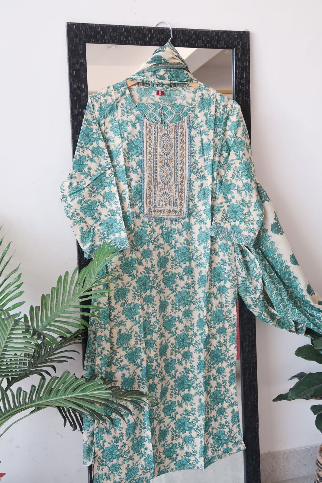 Introducing the a masterpiece of style and sophistication. This three-piece suit set exudes timeless charm with its off-white base adorned with delicate blue floral prints, evoking a sense of serenity and grace. The kurta, featuring a round neck style and quarter sleeves, boasts exquisite zari and embroidery work on the yoke, adding a touch of opulence to the ensemble. Paired with matching cotton pants, comfort meets elegance effortlessly. Completing the look is a matching off-white dupatta, intricately printed with blue floral motifs, adding a harmonious balance to the ensemble. Whether for a formal affair or a special celebration, the Azure Bloom Ensemble promises to captivate hearts with its understated yet captivating allure.