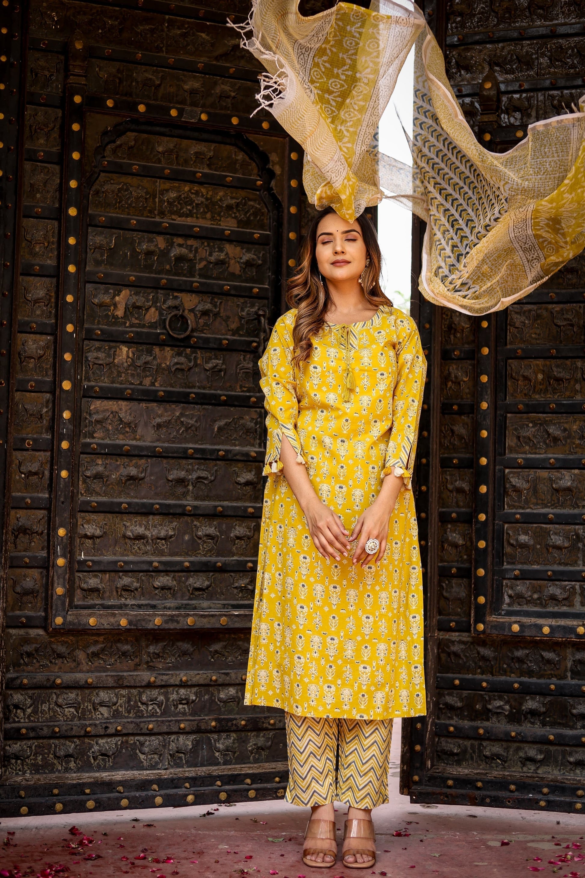 Completing the look is a stunning Kota Doriya handblock printed dupatta, perfectly matching the kurta and pants with its harmonious color palette of yellow, blue, and white. The lightweight and airy fabric of the dupatta drapes gracefully, adding an extra layer of sophistication and elegance to your outfit.